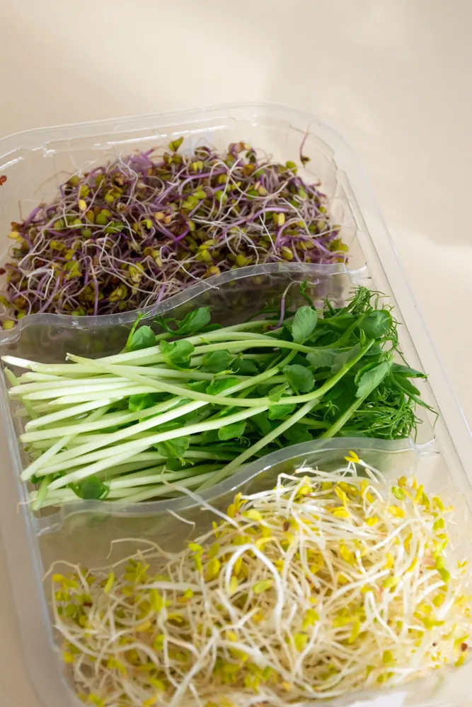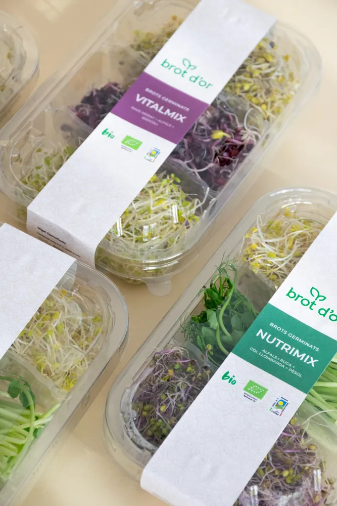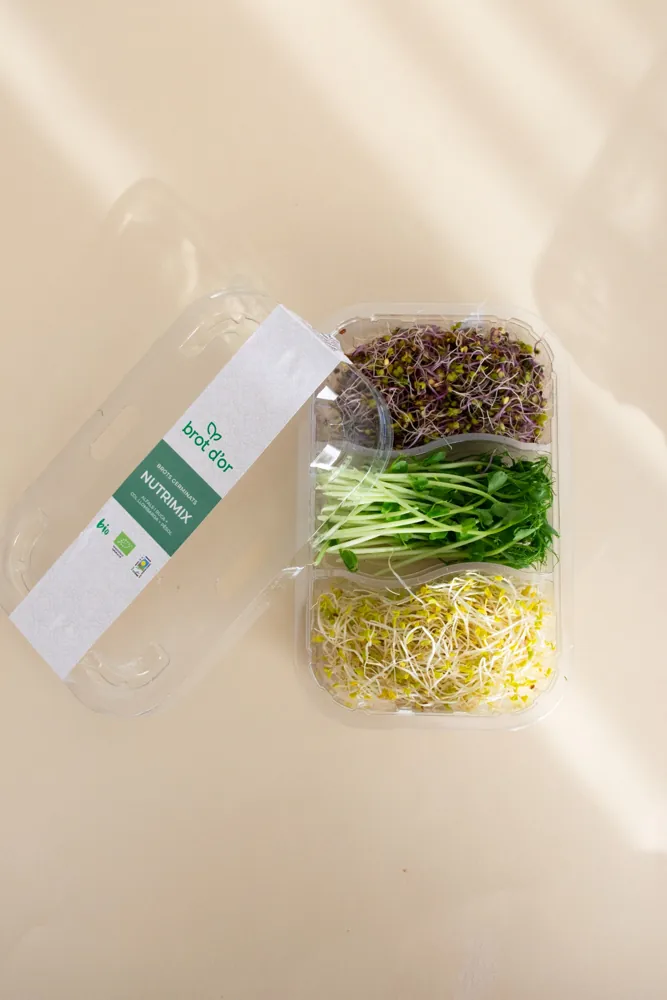Conté: Germinats d’alfals i ruca, col llombarda i de pèsol. Una combinació fresca, cruixent i equilibrada, amb matisos suaus i lleugerament dolços, ideal per a tota mena de plats.